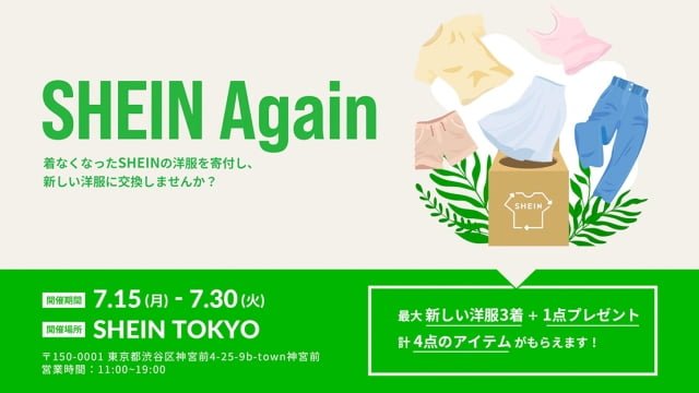 150以上の地域で愛されるグローバルなファッションブランドSHEINでは、2024年7月15日(月)から、古着交換寄付キャンペーン SHEIN AgainをSHEIN TOKYOにて開催!